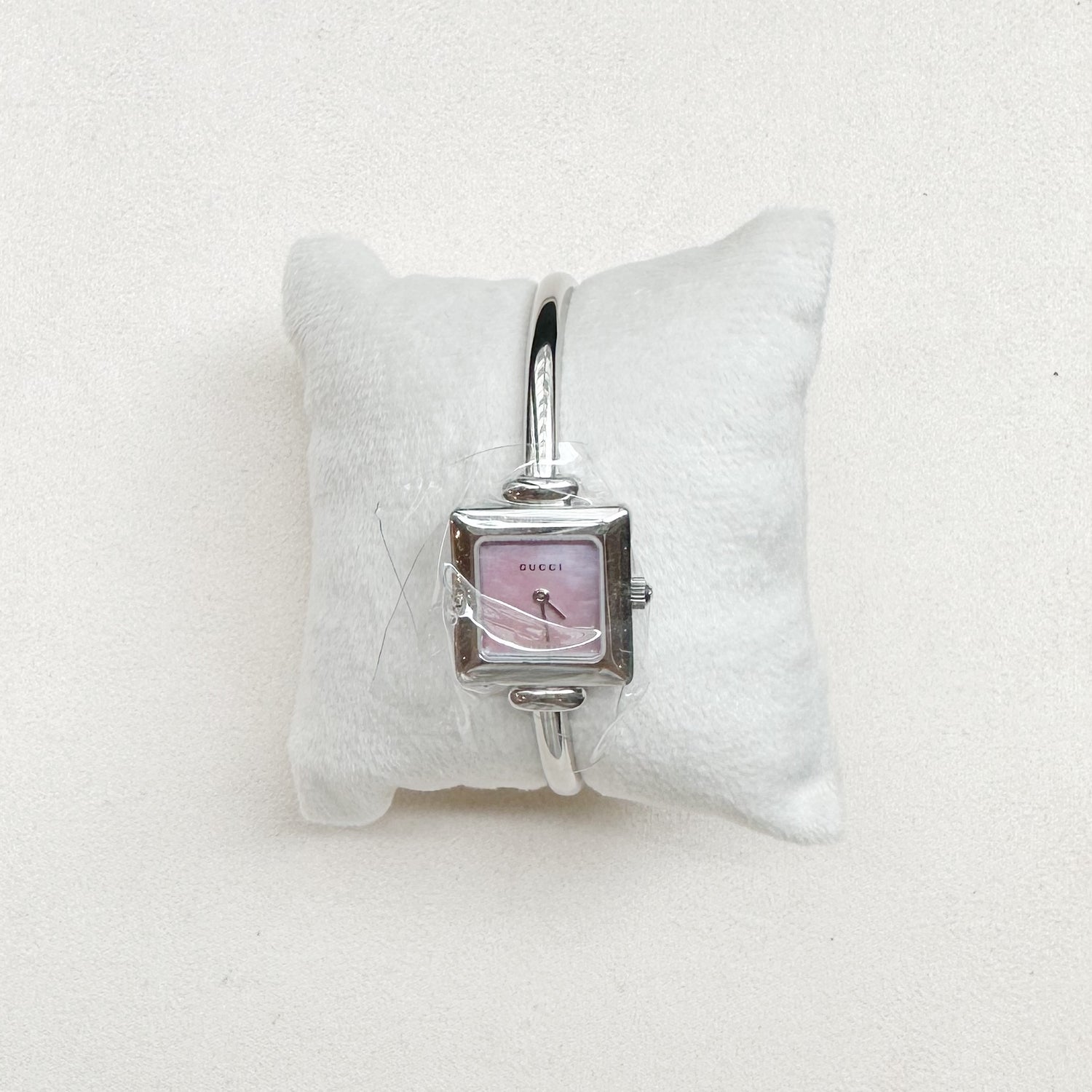 Is a Vintage Gucci Bangle Watch 1900L 12524392 SS QZ Pink MOP dial. The watch comes with no accessories.