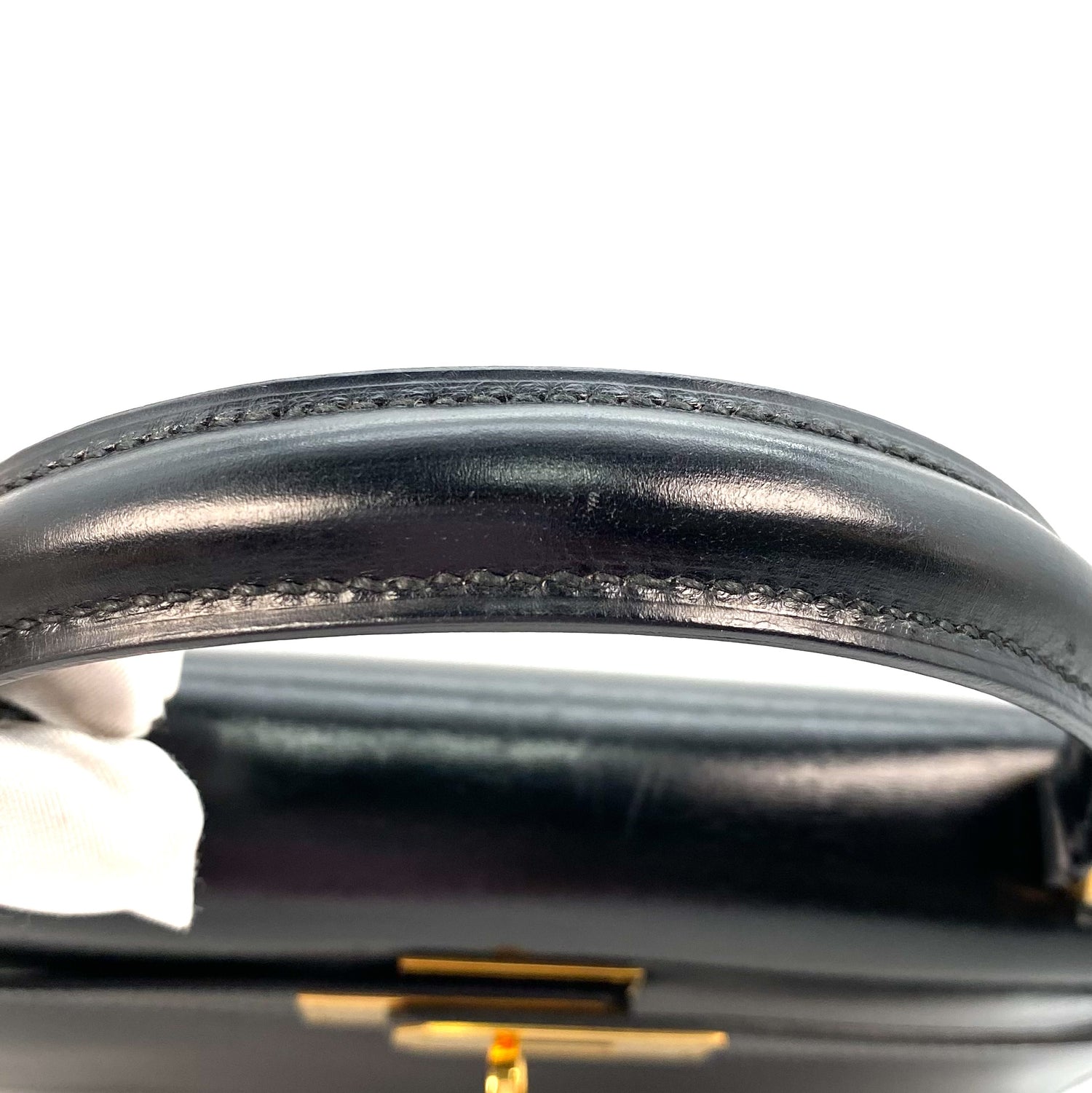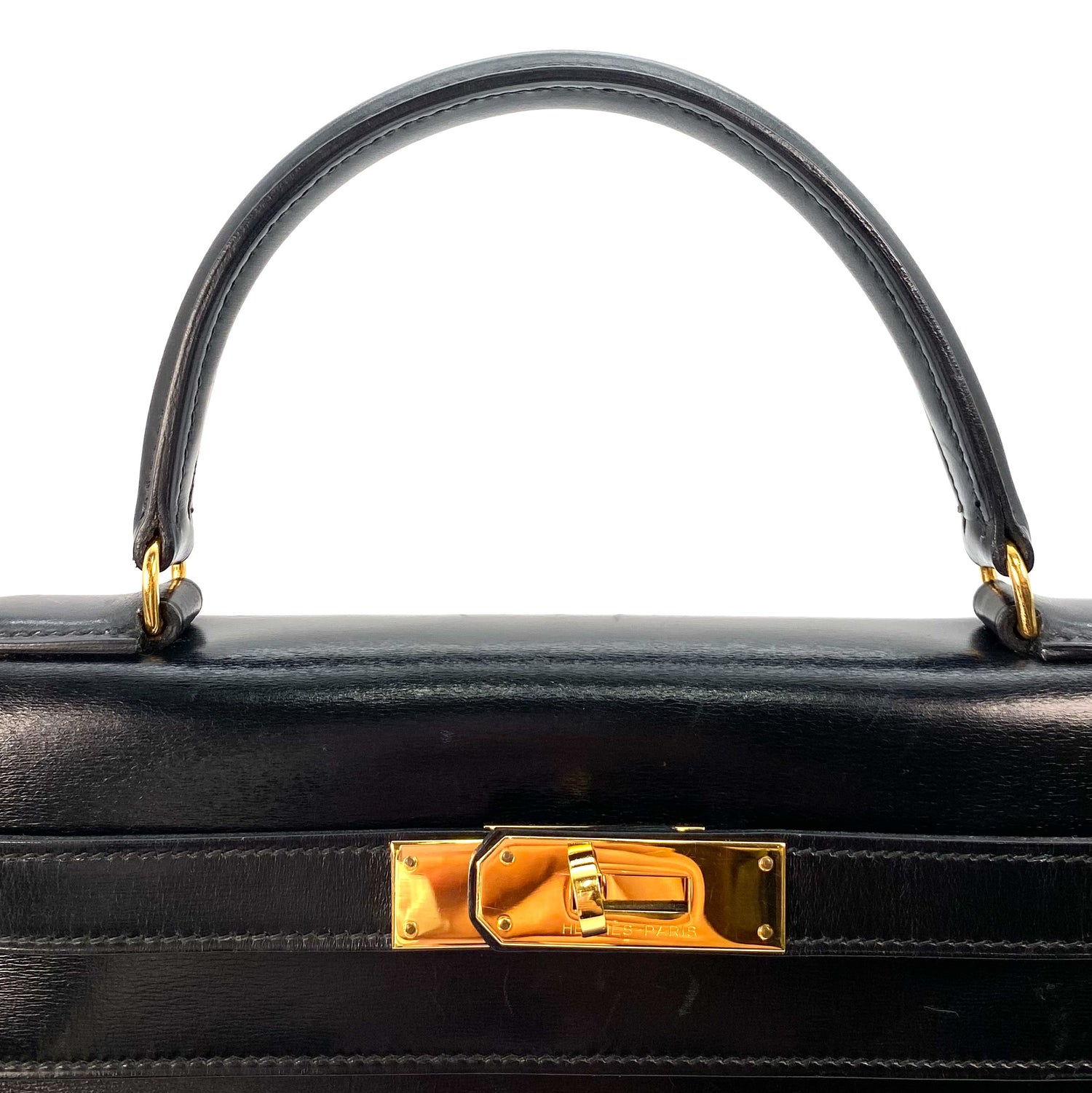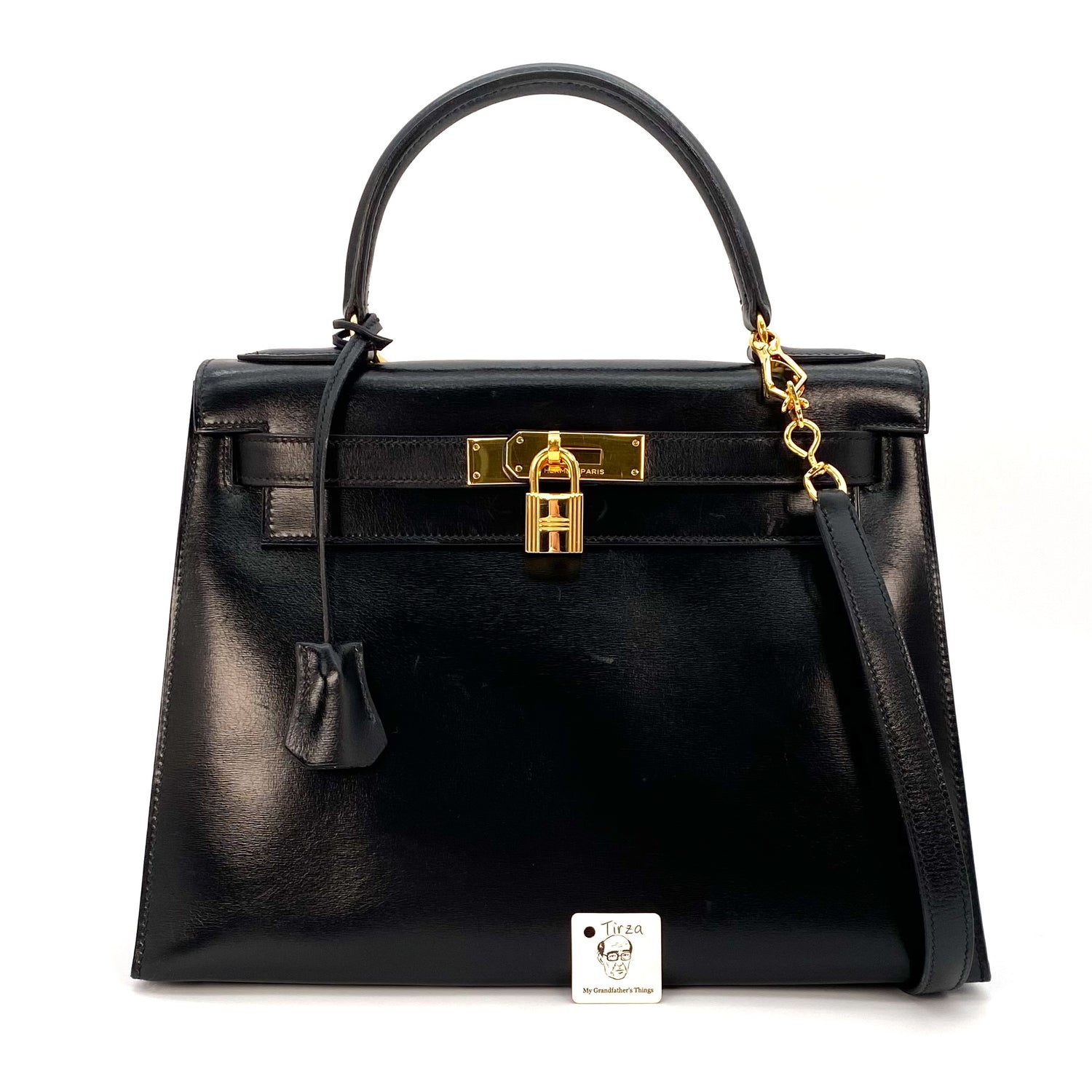 Tirza is a Hermès 1985 Kelly 28 Sellier Black Boxcalf Gold Hardware with stamp 〇O.