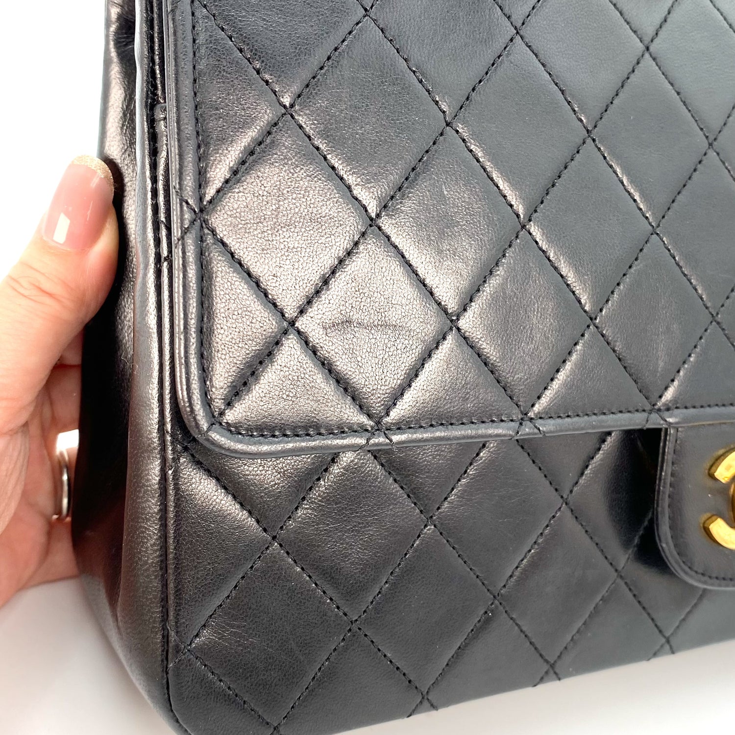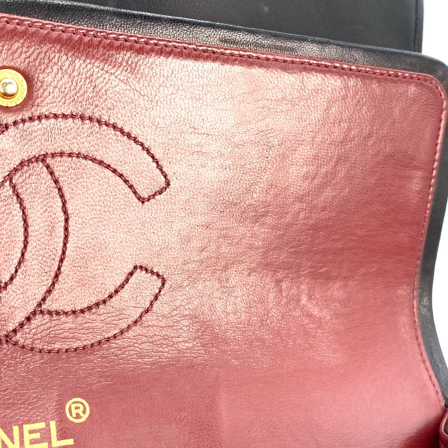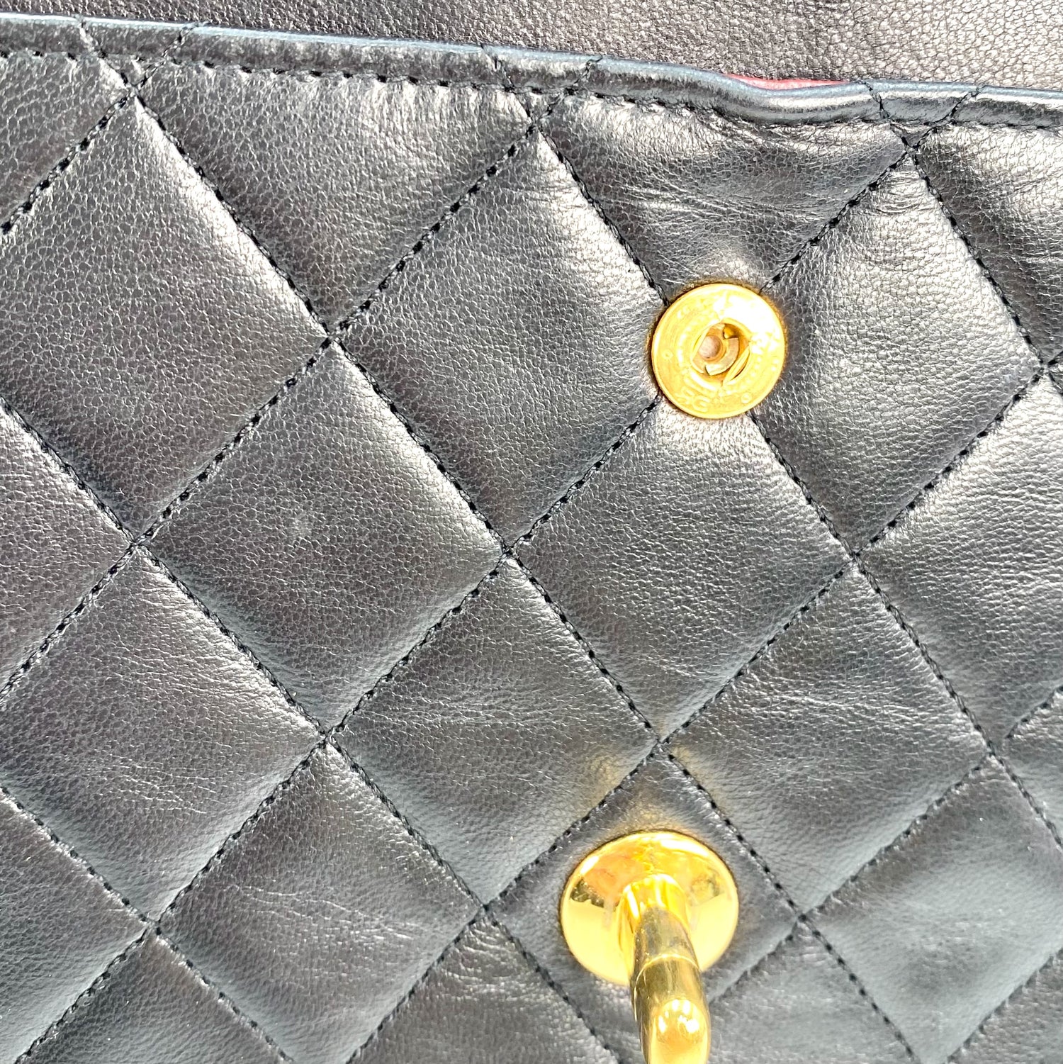 Aria is a vintage Chanel 0 series Vintage Flap with Reissue Chains Black Lambskin with seal and card.