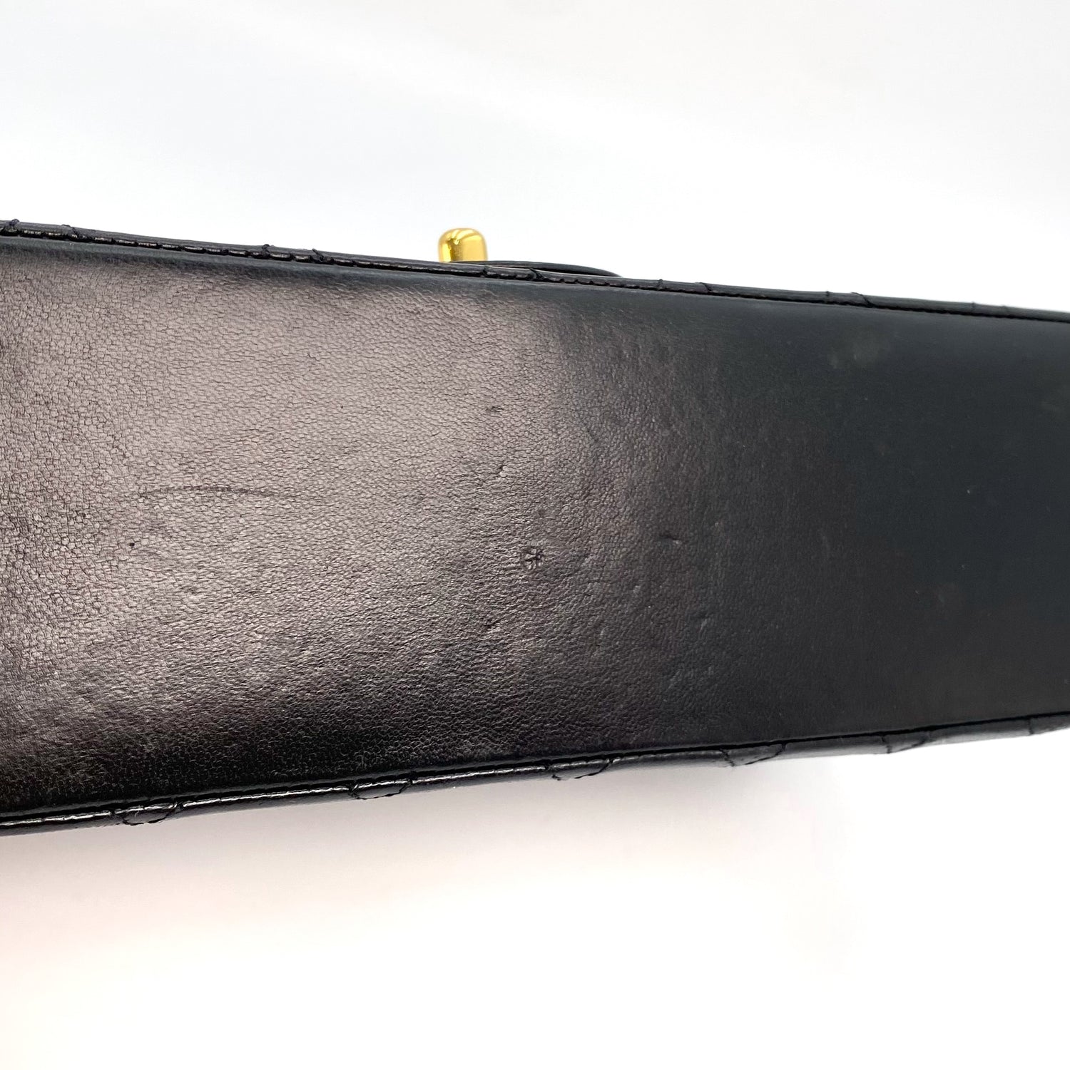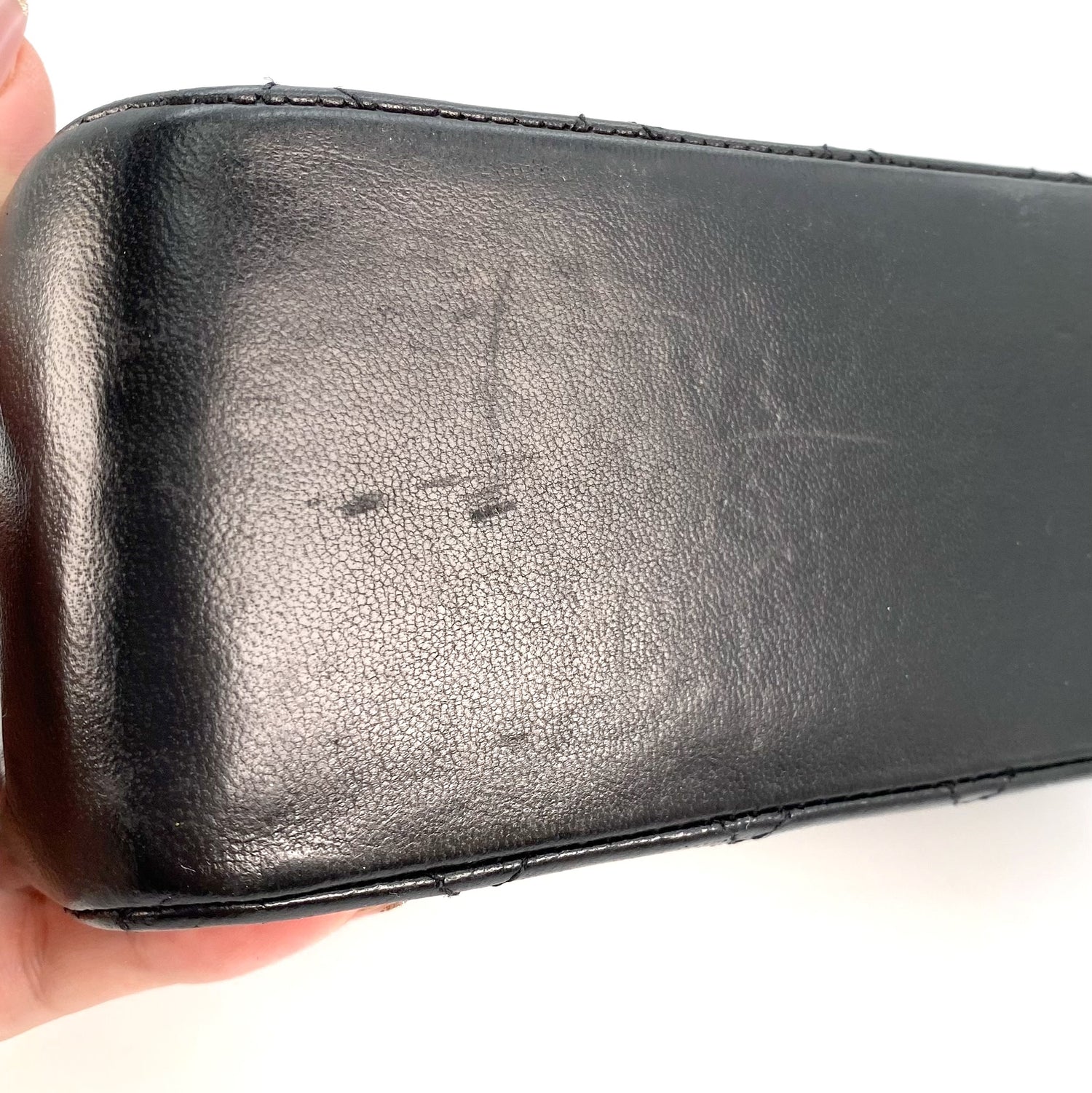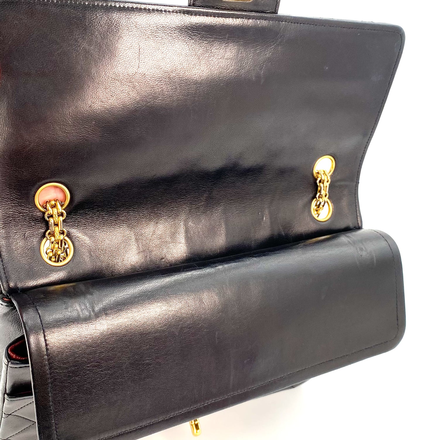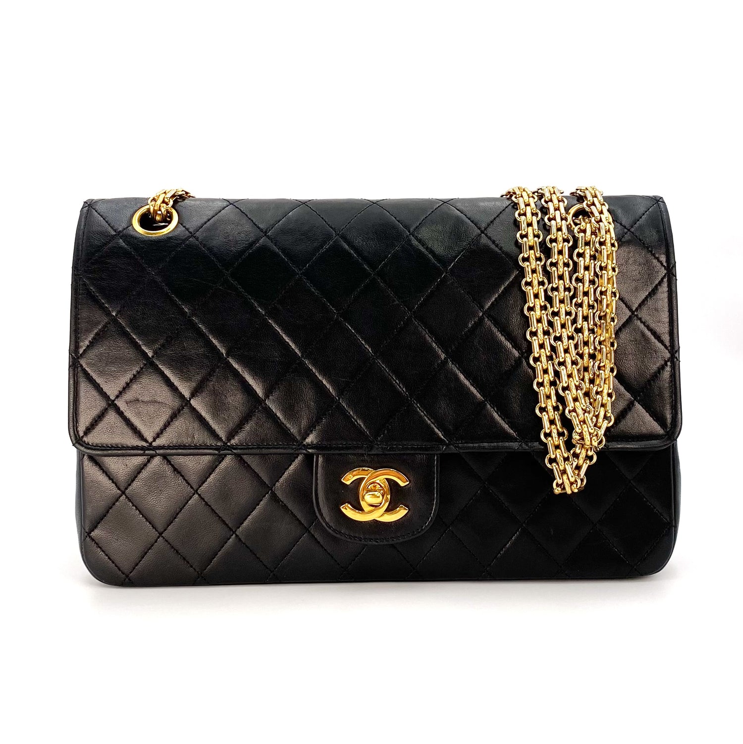 Aria is a vintage Chanel 0 series Vintage Flap with Reissue Chains Black Lambskin with seal and card.