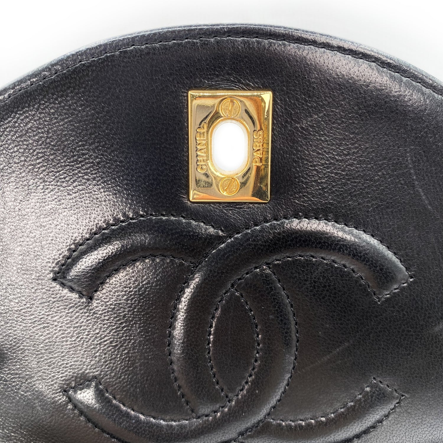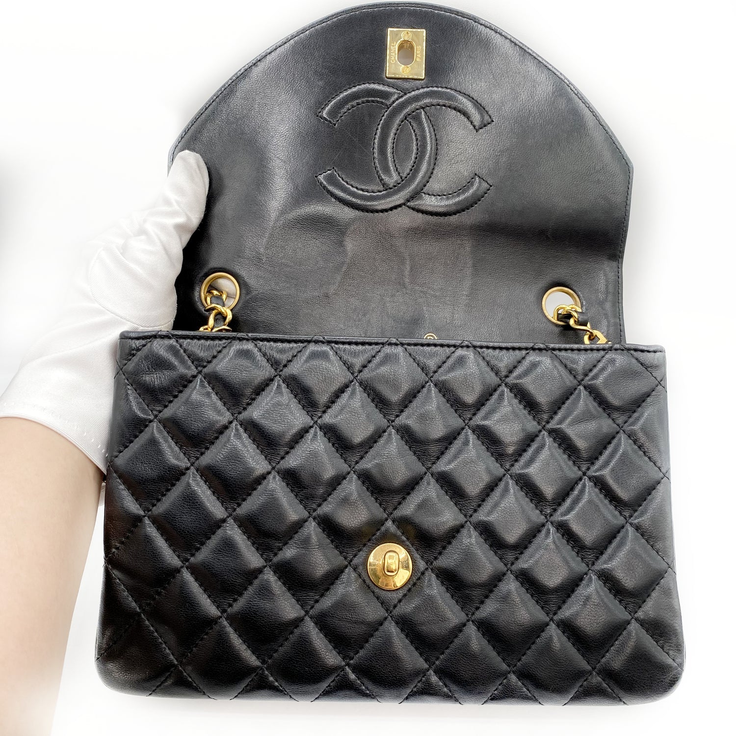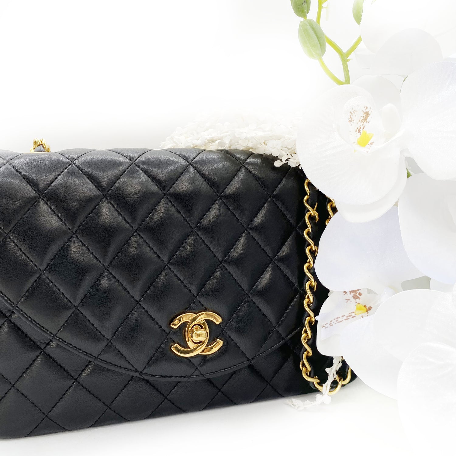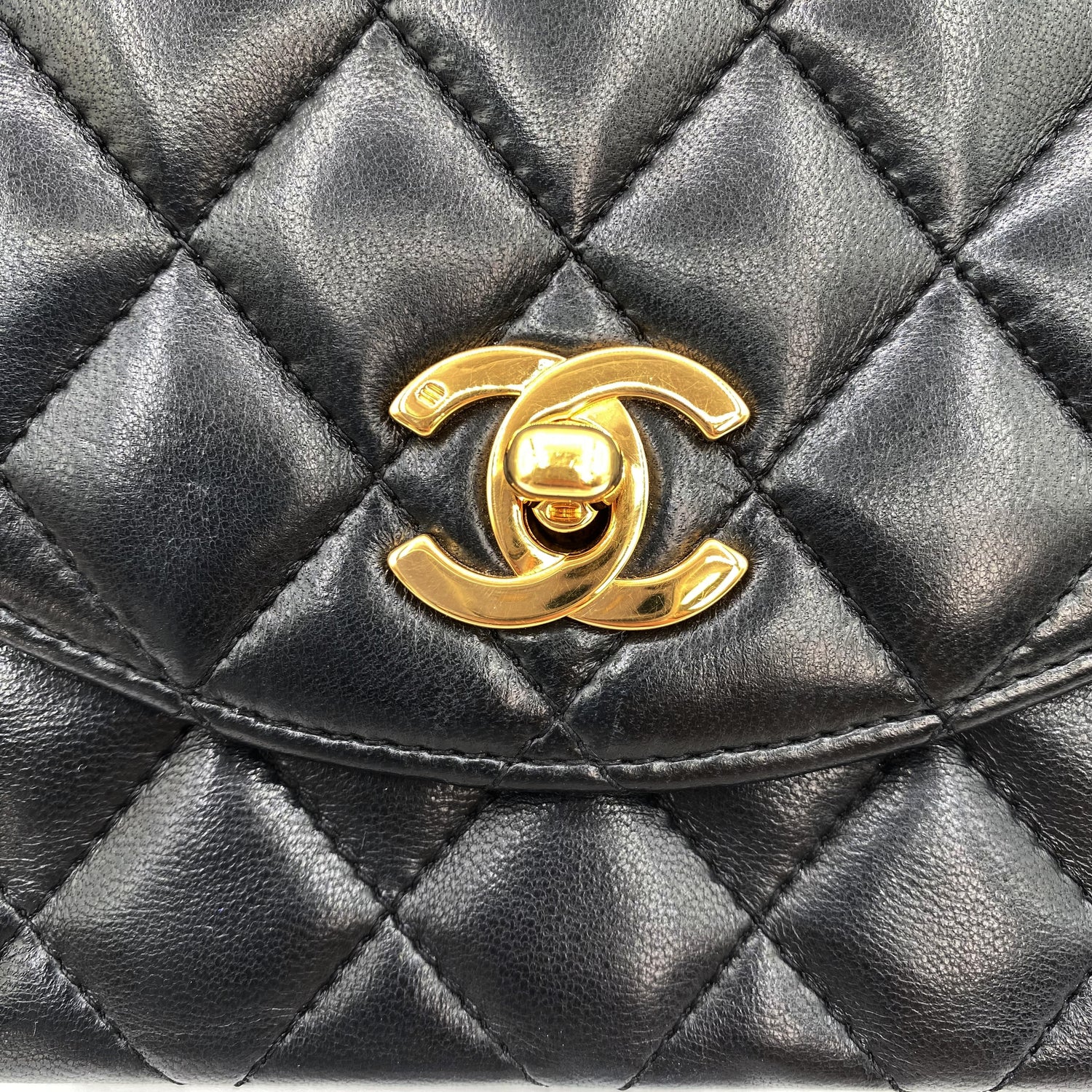 Julio, Vintage Authentic Chanel 1 series matelasse half moon chain black lambskin with seal and card