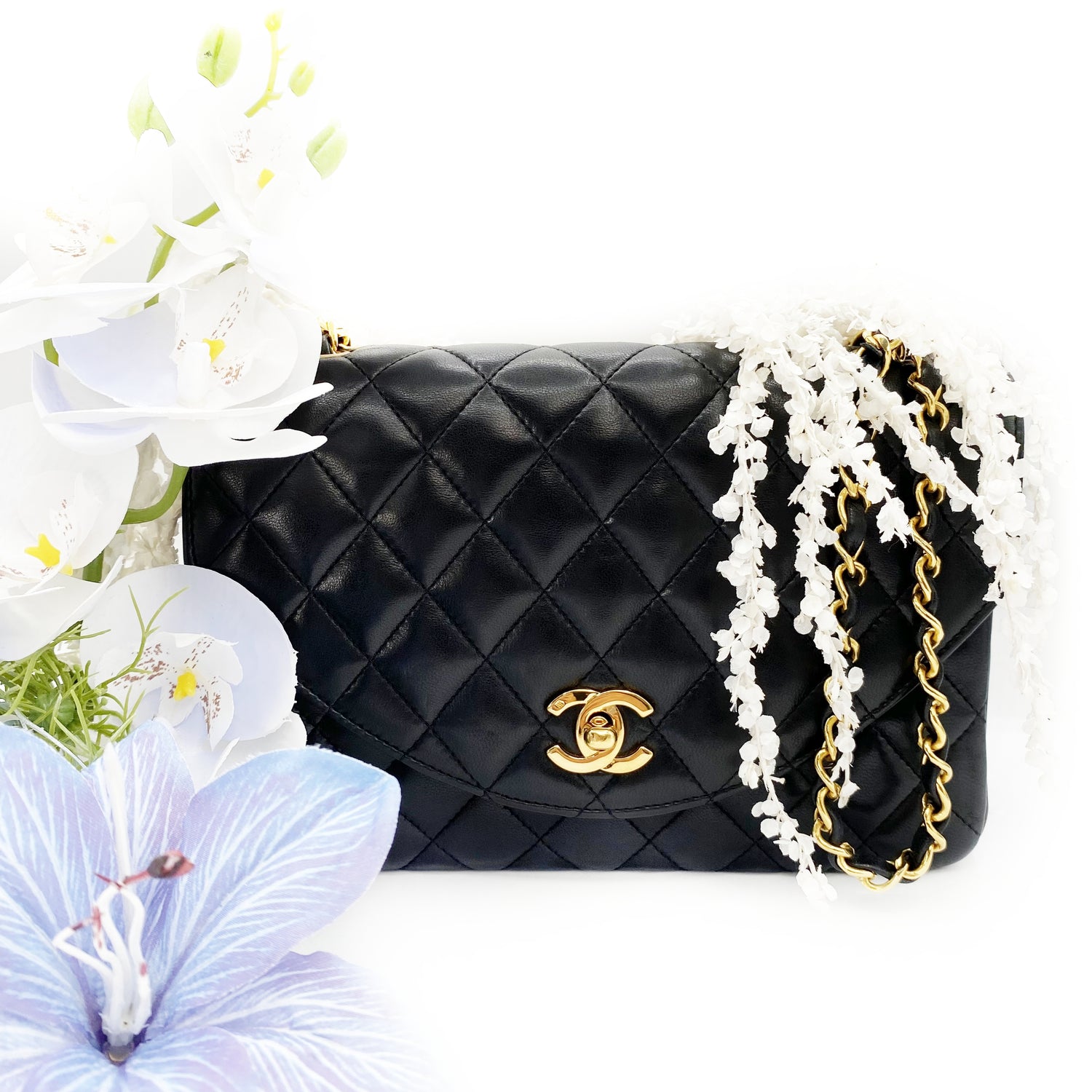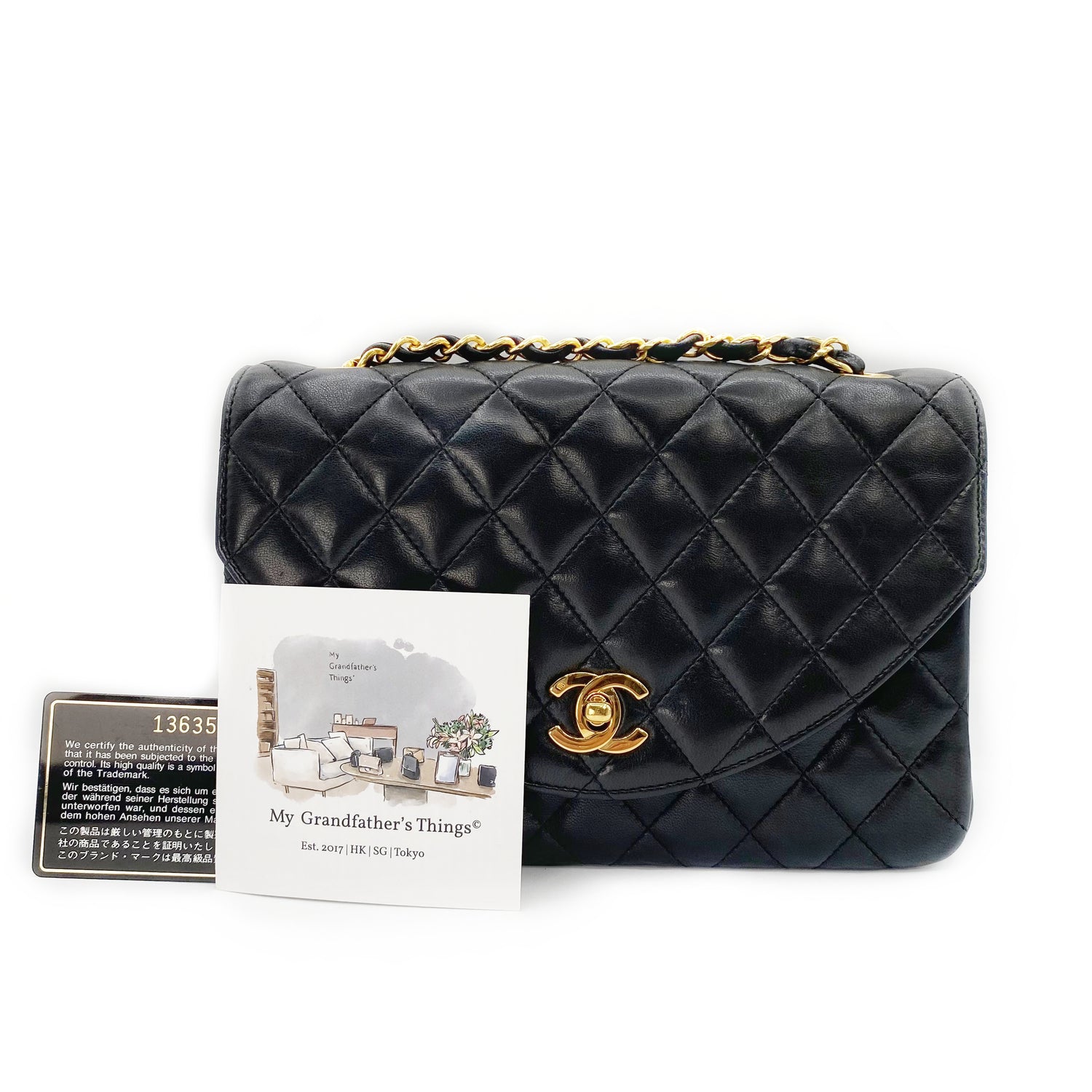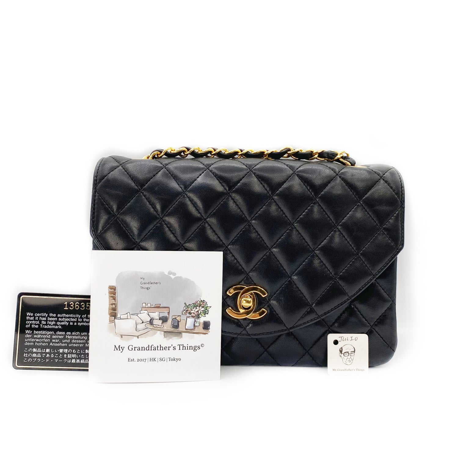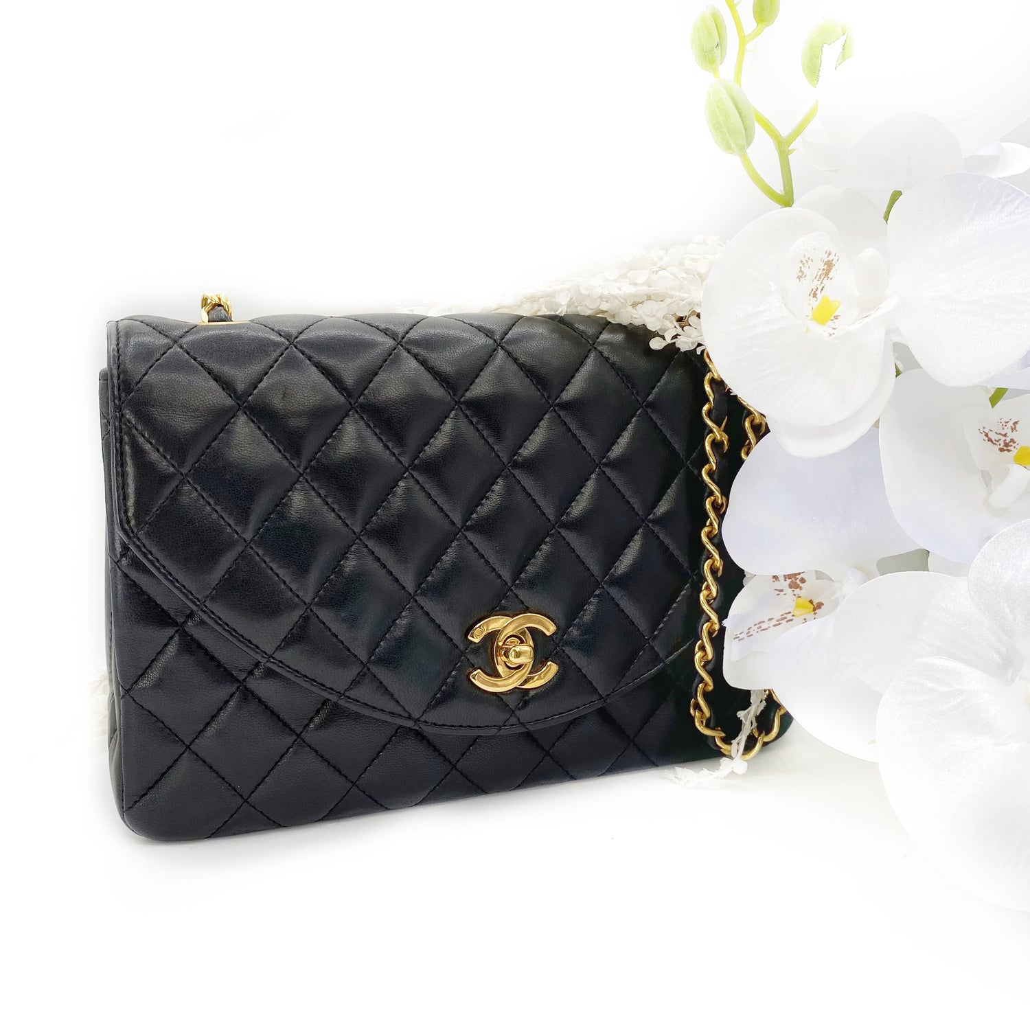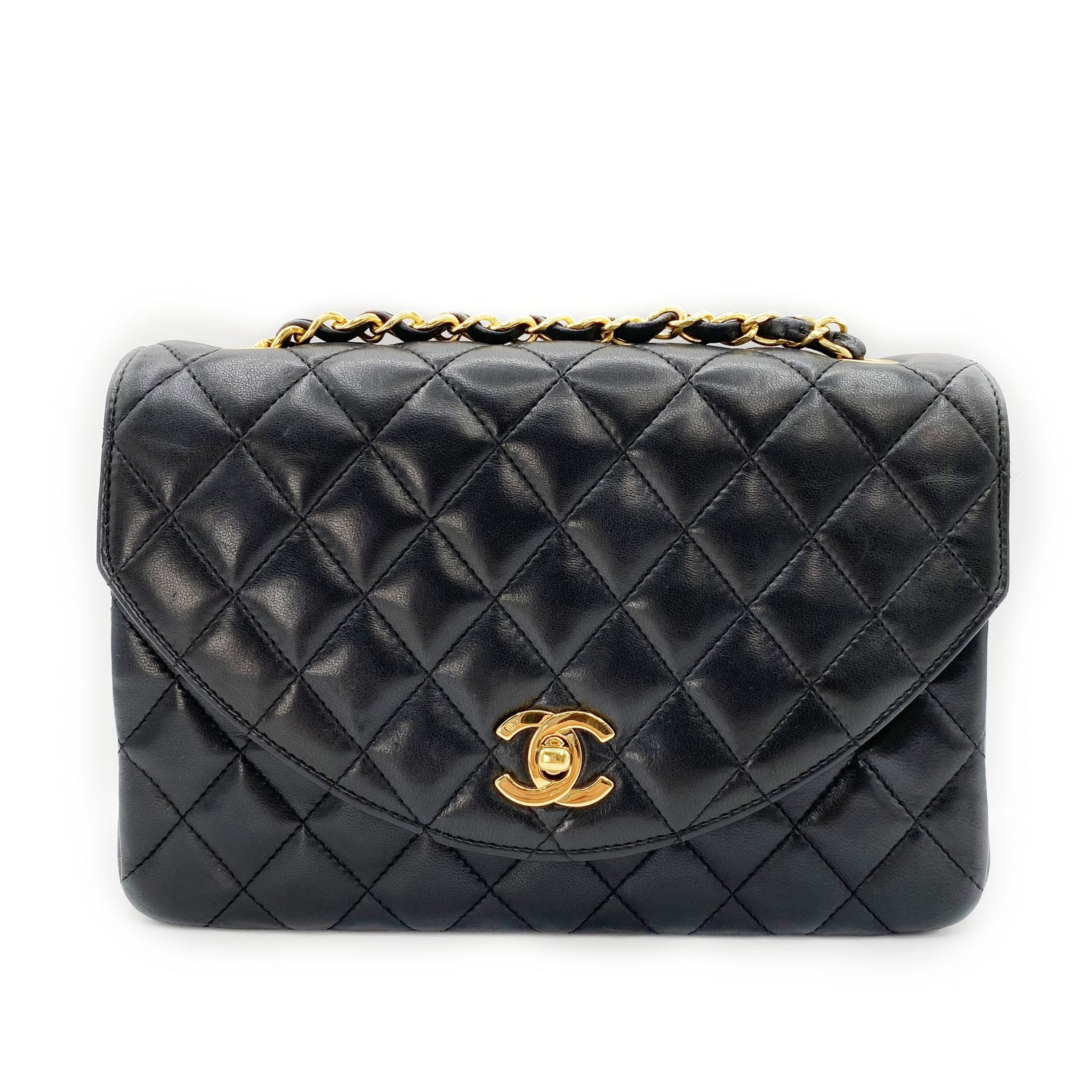 Julio, Vintage Authentic Chanel 1 series matelasse half moon chain black lambskin with seal and card