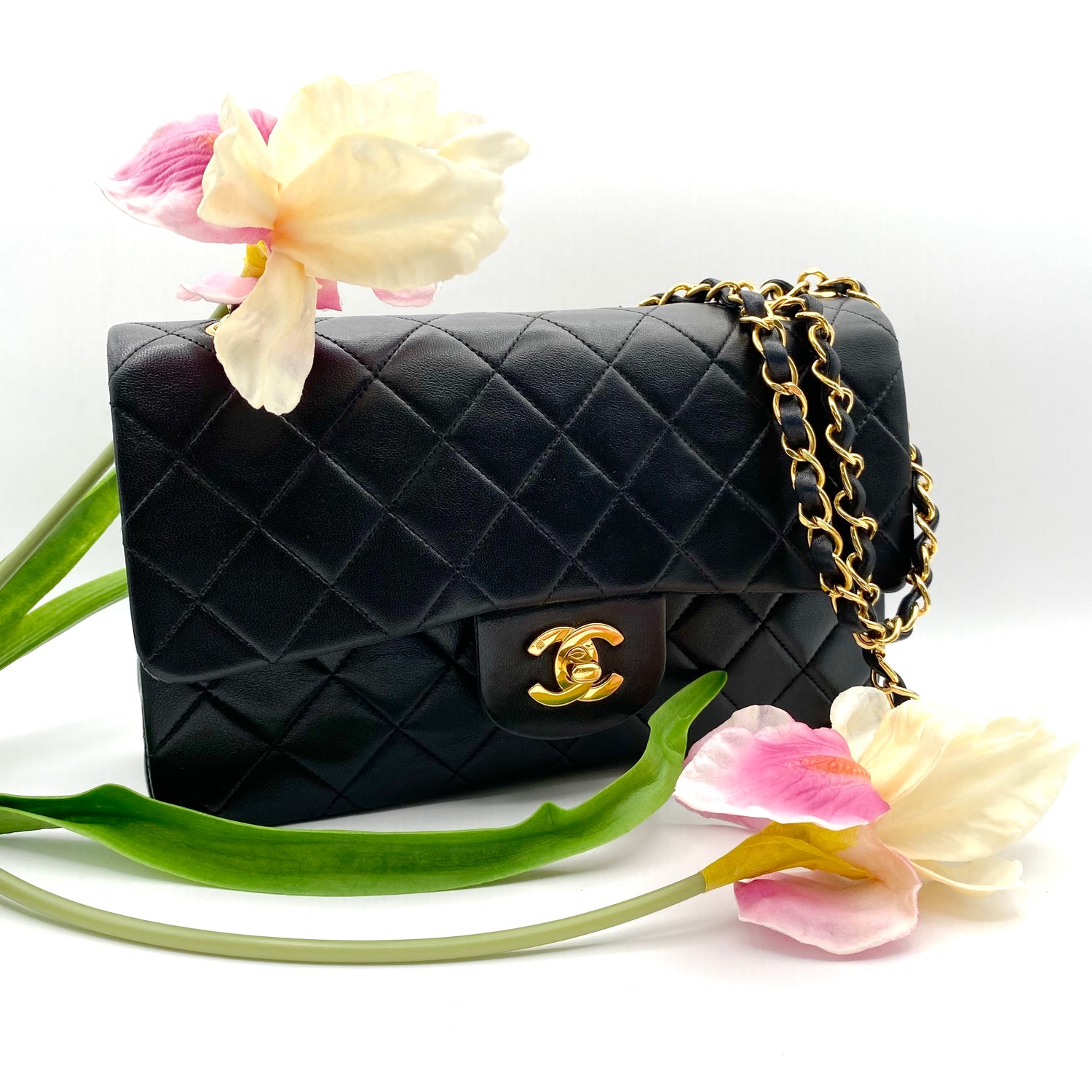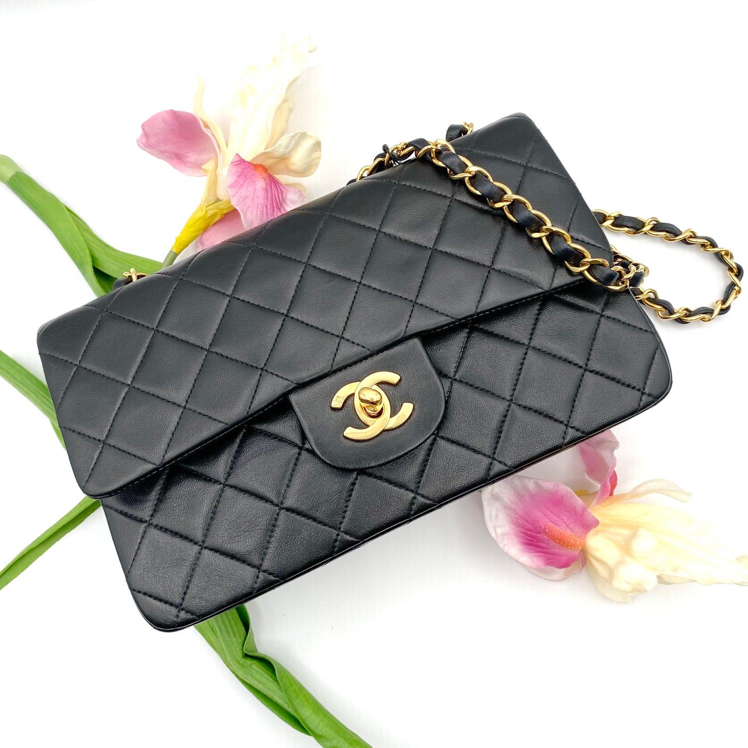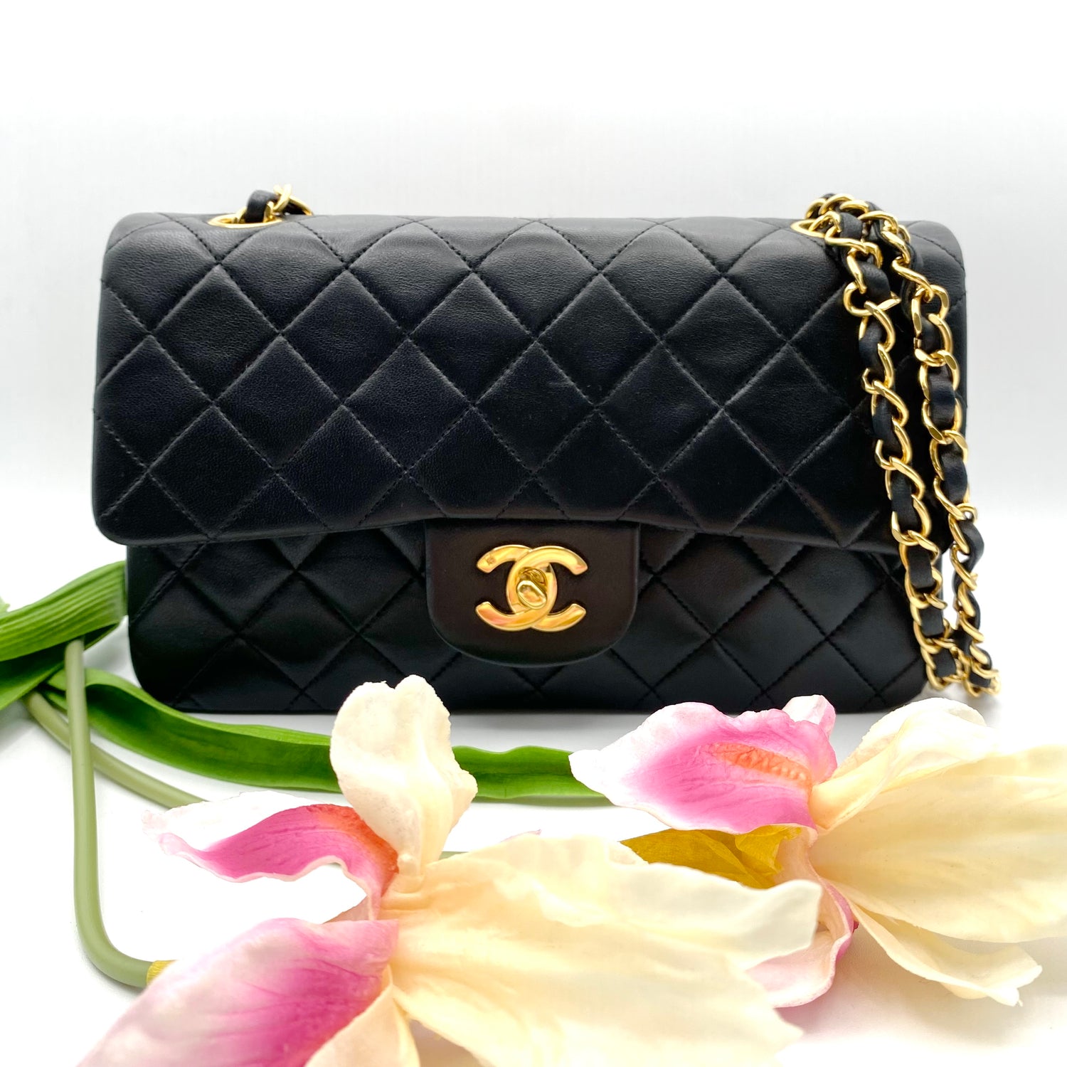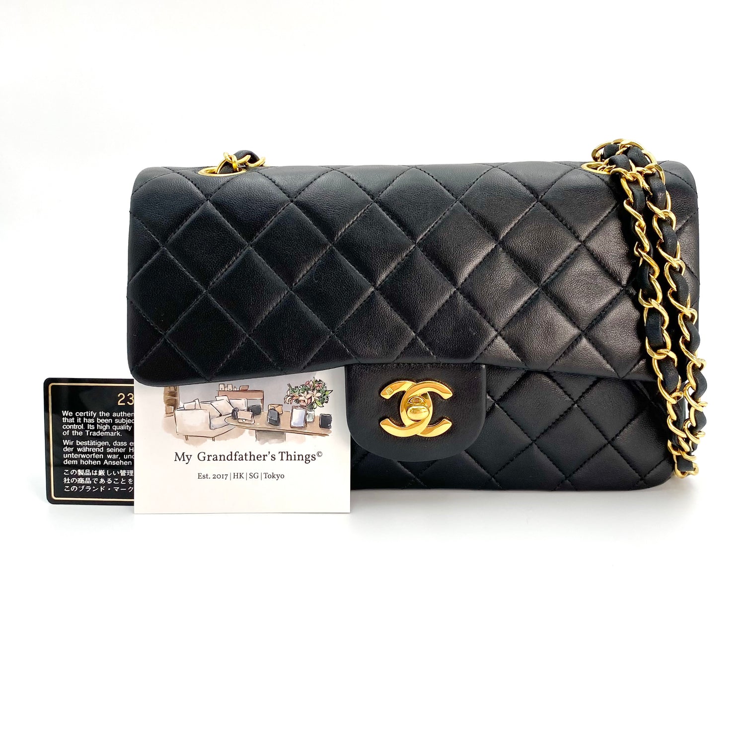 Shawn, Vintage Authentic Chanel 2 series small black classic flap with seal and card